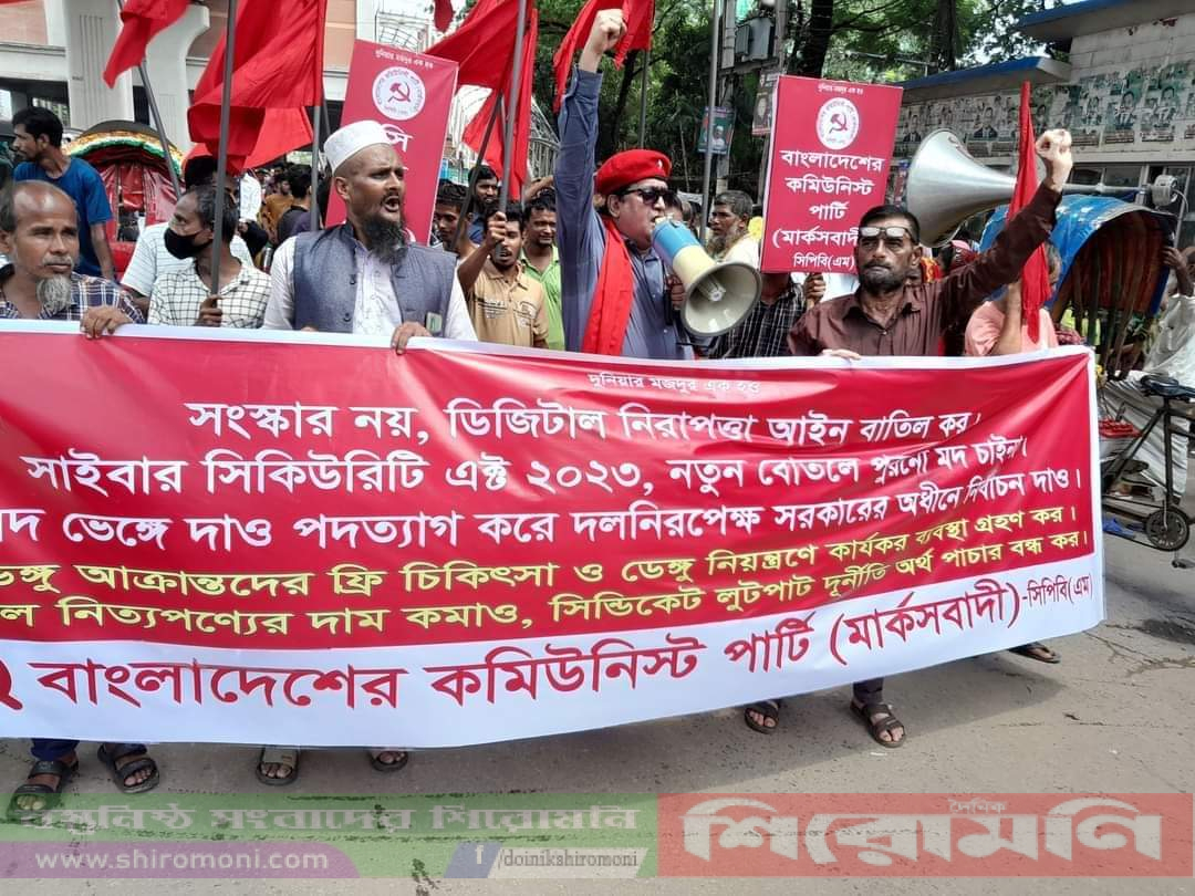 আজ ৯ আগষ্ট বৃহস্পতিবার দুপুরে সংস্কার নয় ডিজিটাল নিরাপত্তা আইন বাতিল,সংসদ ভেংগে দিয়ে পদত্যাগ করে দলনিরপেক্ষ সরকারের অধীনে নির্বাচন, ডেংগু আক্রান্তদের বিনামূল্য চিকিৎসা,দ্রব্যমূল্যর দাম কমানো লুটপাট দুর্ণীতি অর্থ পাচার বন্ধ ও দায়ীদের বিচারের দাবিতে বাংলাদেশের কমিউনিস্ট পার্টি (মার্কসবাদী)র জাতীয় প্রেসক্লাবের সামনে এক সমাবেশ ও বিক্ষোভ মিছিল অনুষ্ঠিত হয় এতে সভাপতিত্ব করেন কেন্দ্রীয় কমিটির সভাপতি কমরেড ডাঃ এম এ সামাদ, সভাপতির বক্তব্য তিনি বলেন ডিজিটাল নিরাপত্তা আইনের নাম পরিবর্তন করে সাইবার সিকিউরিটি এক্ট ২০২৩ প্রনয়ণকে জনগণের সাথে চরম প্রতারণা করেছেন -