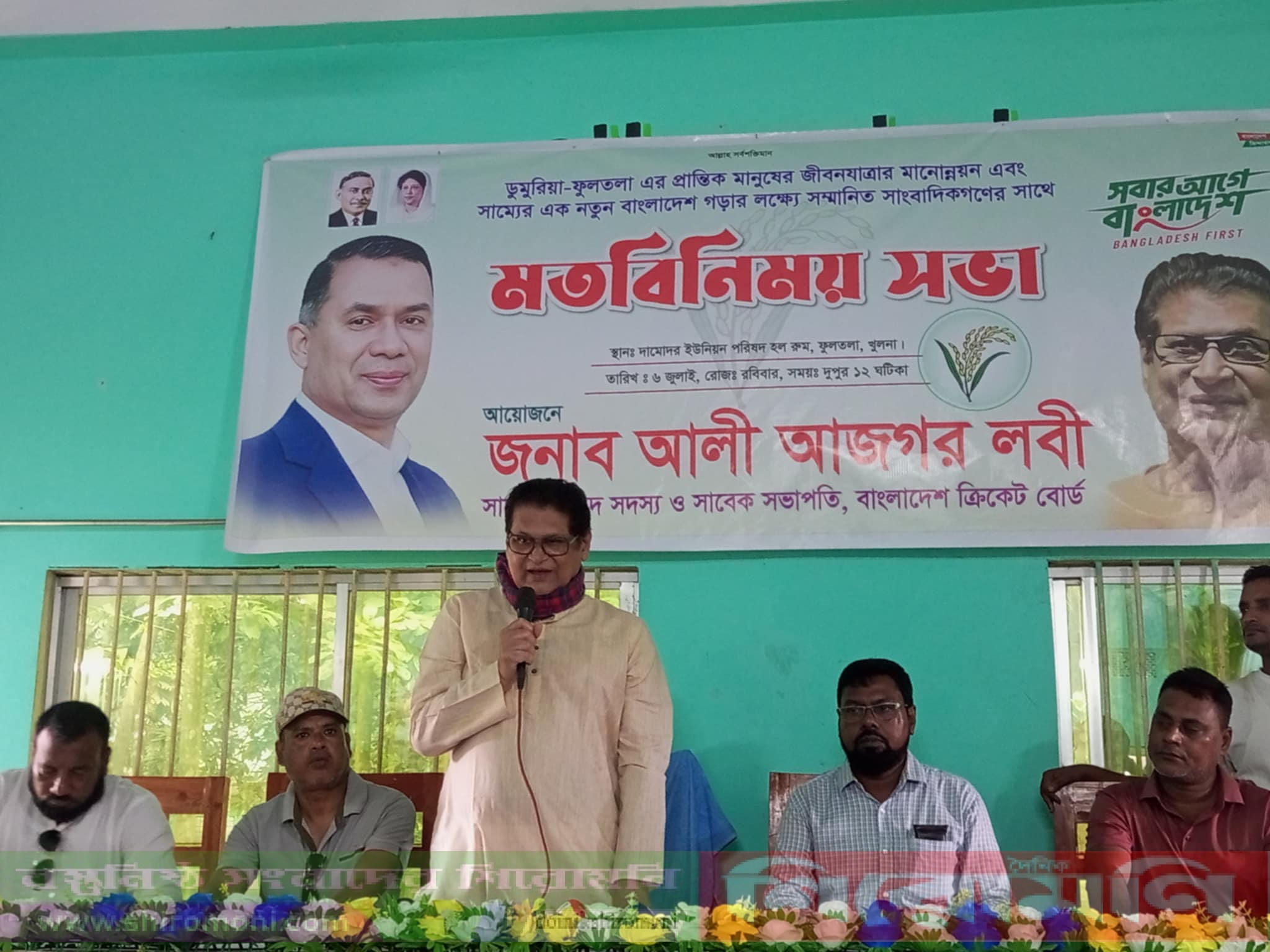 মুন্সী মেহেদী হাসান, ফুলতলা উপজেলা প্রতিনিধিঃ খুলনা -৫ আসন তথা ফুলতলা - ডুমুরিয়া বাসির দীর্ঘদিনের প্রত্যাশা পূরণ, সার্বিক মানোন্নয়ন, সাম্যের নতুন বাংলাদেশ আর জনগণের প্রত্যাশা পূরণে আমরা অঙ্গীকারবদ্ধ। বিএনপি জনগনের এবং জনসমর্থনের রাজনীতি করে বলেও উল্লেখ করেন বাংলাদেশ ক্রিকেট বোর্ডের সাবেক সভাপতি, সাবেক এমপি খুলনা ২, আলহাজ্ব আলী আজগার লবী। তিনি আরও বলেন আমি দলীয় নির্দেশনা মোতাবেক নিজ এলাকায় কাজ করছি। দল আমাকে চুড়ান্ত মনোনয়ন দিলে এবং আমি নির্বাচিত হতে পারলে অবহেলিত ফুলতলা ,ডুমুরিয়া বাসীর সর্বোচ্চ প্রত্যাশা পূরনে কাজ করবো। ফুলতলা উপজেলাধীন আটরা শিল্প অঞ্চলের বন্ধ মিল কলকারখানা চালু , বিল ডাকাতির জলবদ্ধতা স্থায়ীভাবে নিরসন সহ আধুনিক ফুলতলা-ডুমুরিয়া তথা খুলনা ৫ আসন গড়ে তুলবো ।