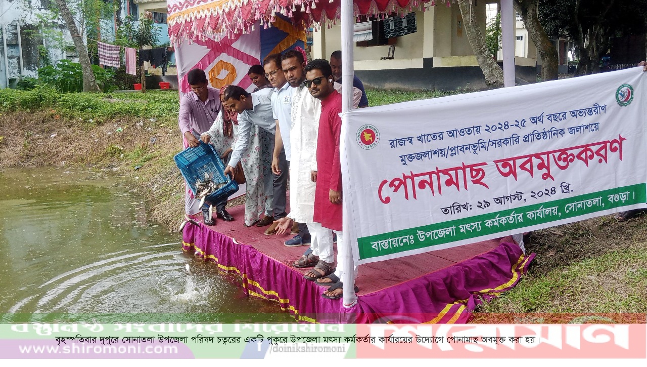 শিমন আহম্মেদ বাদল, সোনাতলা (বগুড়া) উপজেলা প্রতিনিধি: বৃহস্পতিবার দুপুরে বগুড়ার সোনাতলা উপজেলা পরিষদের একটি পুকুরে পোনা মাছ অবমুক্ত করা হয়। উপজেলা মৎস্য কর্মকর্তার কার্যালয়ের বাস্তবায়নে পোনা মাছ অবমুক্ত করেন বগুড়া জেলা মৎস্য কর্মকর্তা মো: আরিফুজ্জামান। এ সময় উপস্থিত ছিলেন উপজেলা মৎস্য কর্মকর্তা মোস্তফা কামাল, উপজেলা প্রকৌশলী মাহবুবুল হক , মৎস্য সম্প্রসারণ কর্মকর্তা রোকসানা, হিসাবরক্ষণ কর্মকর্তা রুহুল আমিন, নির্বাচন কর্মকর্তা আলমগীর হোসেন ,পল্লী উন্নয়ন কর্মকর্তা লিপিকা রানী, পৌর যুবদলের সিনিয়র যুগ্ন আহবায়ক মাহমুদুর রহমান রনি, উপজেলা ছাত্রদলের সভাপতি সাজ্জাদুর রহমান চাঁদ ,পৌর ছাত্রদলের সভাপতি বকুল মিয়া,ঠিকাদারী প্রতিষ্ঠান আঁখি এন্টার প্রাইজের প্রতিনিধি আল আমিন ও মৎস্য অফিসের অফিস সহকারী আশরাফুল ইসলাম, একইদিন উপজেলার ১১টি জলাশয়ে পোনা মাছ অবমুক্ত করা হয়।