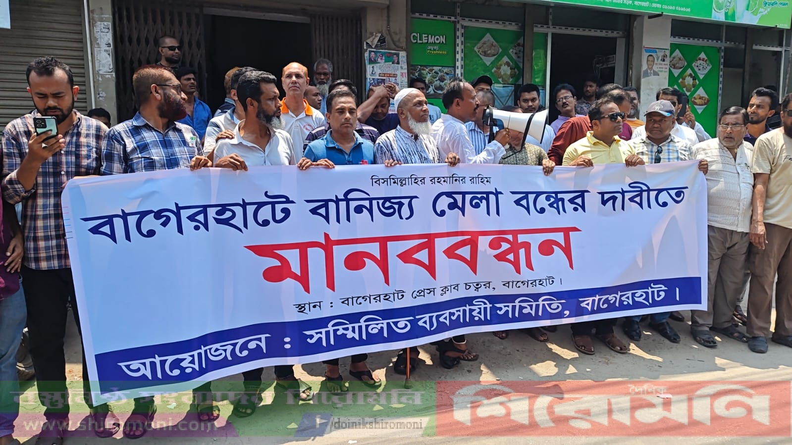 মেহেদী হাসান বাচ্চু,বাগেরহাট প্রতিনিধি:বাগেরহাট শহরের পৌর পার্কে বাণিজ্য মেলা শুরুর আগেই স্থানীয় ব্যবসায়ী সমিতির নেতারা মেলা বন্ধের দাবিতে মানববন্ধন ও বিক্ষোভ কর্মসূচি পালন করেছেন। বৃহস্পতিবার সকালে বাগেরহাট প্রেসক্লাবের সামনে ঘন্টা ব্যাপী এই মানববন্ধন ও বিক্ষোভ কর্মসূচি পালিত হয়।
