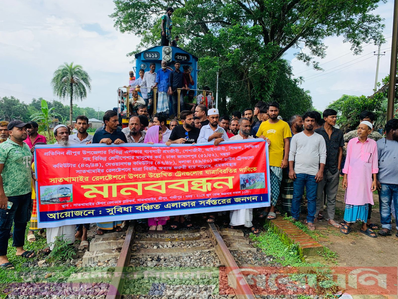 রাকিবুল হাসান, গাজীপুর প্রতিনিধি : ঢাকা-ময়মনসিংহ রেললাইন, গাজীপুর শ্রীপুর উপজেলার বন্ধ থাকা সাতখামাইর রেলস্টেশন চালু করার দাবিতে মানববন্ধন করেছে এলাকাবাসী। এসময় তারা সাতখামাইর ষ্টেশনে পৃথক সময়ে ঢাকাগামী জামালপুর কমিউটার এবং মোহনগঞ্জগামী মহুয়া কমিউটার ট্রেন আটকে আটকে এ কর্মসূচী পালন করে। সোমবার (২৩ জুন) মানববন্ধনে সাতখামাইর ও এর আশপাশের কয়েকটি এলাকার সকল শ্রেণী পেশার মানুষ অংশ নেয়।